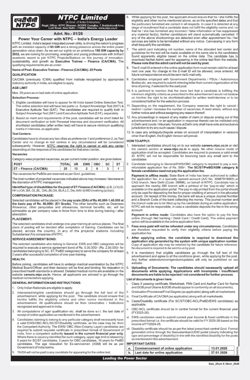 NTPC Recruitment 2026 – Executive Trainee Finance (CA/CMA) | 25 Posts, Salary ₹1.40 Lakh