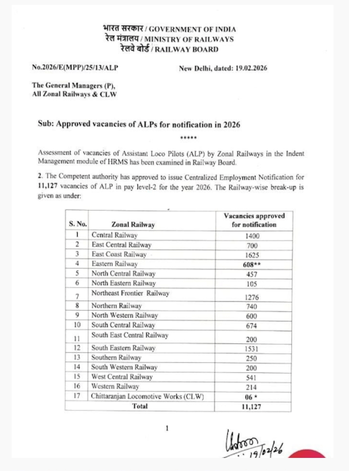RRB ALP Vacancy 2026 – 11,127 Assistant Loco Pilot Posts Announced